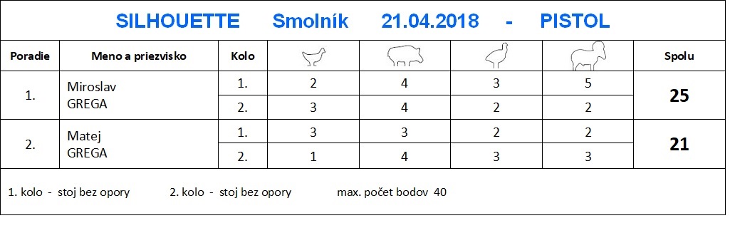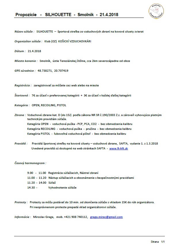Vážení priatelia, v mene streleckého klubu KOŠICKÍ VZDUCHOVKÁRI Vás pozývam na strelecký víkend, ktorý sa začne v sobotu 21.4.2018 v Smolníku súťažou SILHOUETTE - športová streľba zo vzduchových zbraní na kovové siluety.