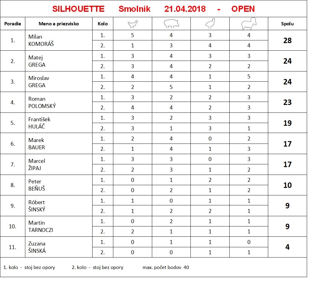 Kirk, organizačne to vyšlo tak, že Matej strieľal kategóriu OPEN aj kategóriu PISTOL skôr ako ja. Takže ja som sa v obidvoch prípadoch len "doťahoval" na Matejov výkon. Pušku sme mali na konci bodovo rovnako, ale Matej po spätnom prerátaní od posledného výstrelu mal viac zostrelených moriakov takže získal lepšie umiestnenie. V pištoli sa zase viac darilo mne tak sme si poradie vymenili.