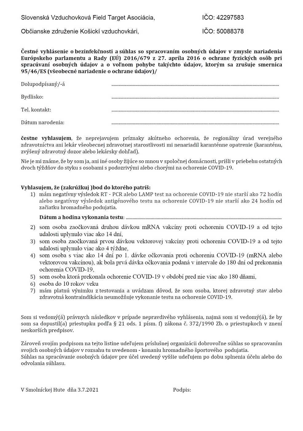 Každý účastník je pred podujatím povinný vyplniť a odovzdať organizátorovi Čestné vyhlásenie o bezinfekčnosti.