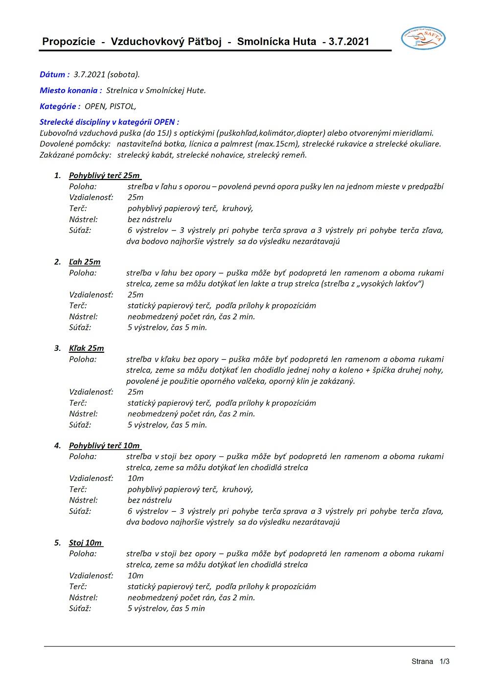Súťažiaci berie na vedomie, že pripravená trať nezabezpečuje absolútnu bezpečnosť pre použitie strelnej zbrane a zaväzuje sa zo zbrane nevystreliť pokiaľ by nastali okolnosti v zmysle § 55 ods. (11) Zákona č. 190/2003 Z. z. o strelných zbraniach a strelive a o zmene a doplnení niektorých zákonov t.j, že streľba zo zbrane kategórie D je zakázaná na mieste, kde môže byť ohrozený život alebo zdravie osôb alebo spôsobená škoda na majetku. Pred každým výstrelom je súťažiaci povinný sa ubezpečiť, že je zabezpečená bezpečnosť osôb, zvierat a nehrozí poškodenie cudzej veci.