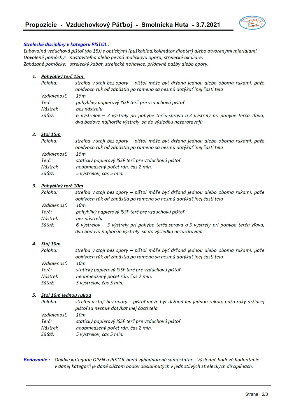 Strelecké disciplíny v kategórii PISTOL : Jednotlivé strelecké disciplíny sú popísané v priložených propozíciách.