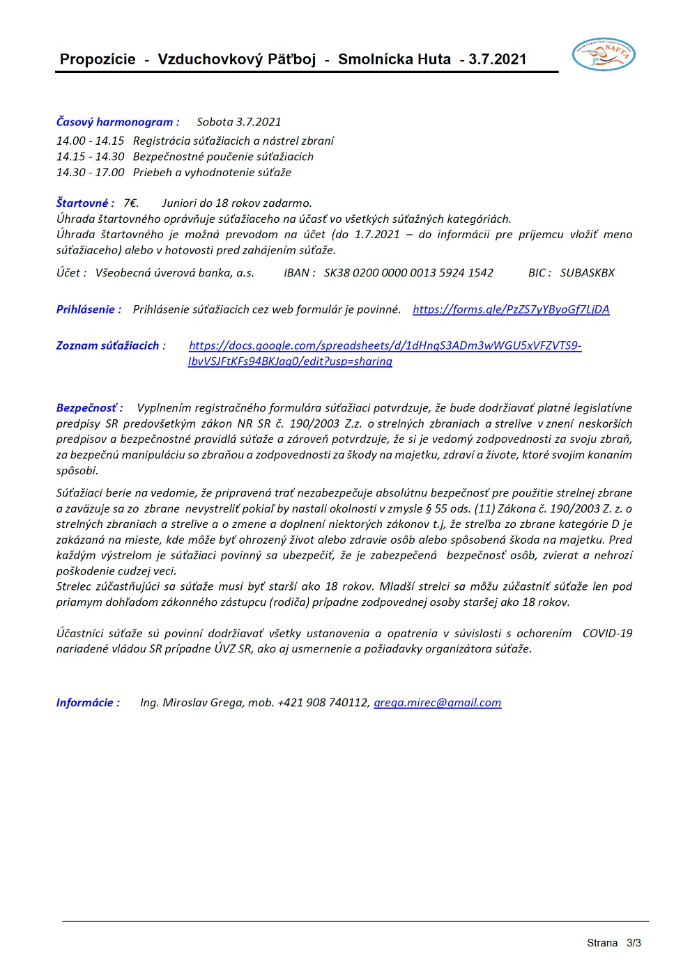 Bezpečnosť : Vyplnením registračného formulára súťažiaci potvrdzuje, že bude dodržiavať platné legislatívne predpisy SR predovšetkým zákon NR SR č. 190/2003 Z.z. o strelných zbraniach a strelive v znení neskorších predpisov a bezpečnostné pravidlá súťaže a zároveň potvrdzuje, že si je vedomý zodpovednosti za svoju zbraň, za bezpečnú manipuláciu so zbraňou a zodpovednosti za škody na majetku, zdraví a živote, ktoré svojim konaním spôsobí.